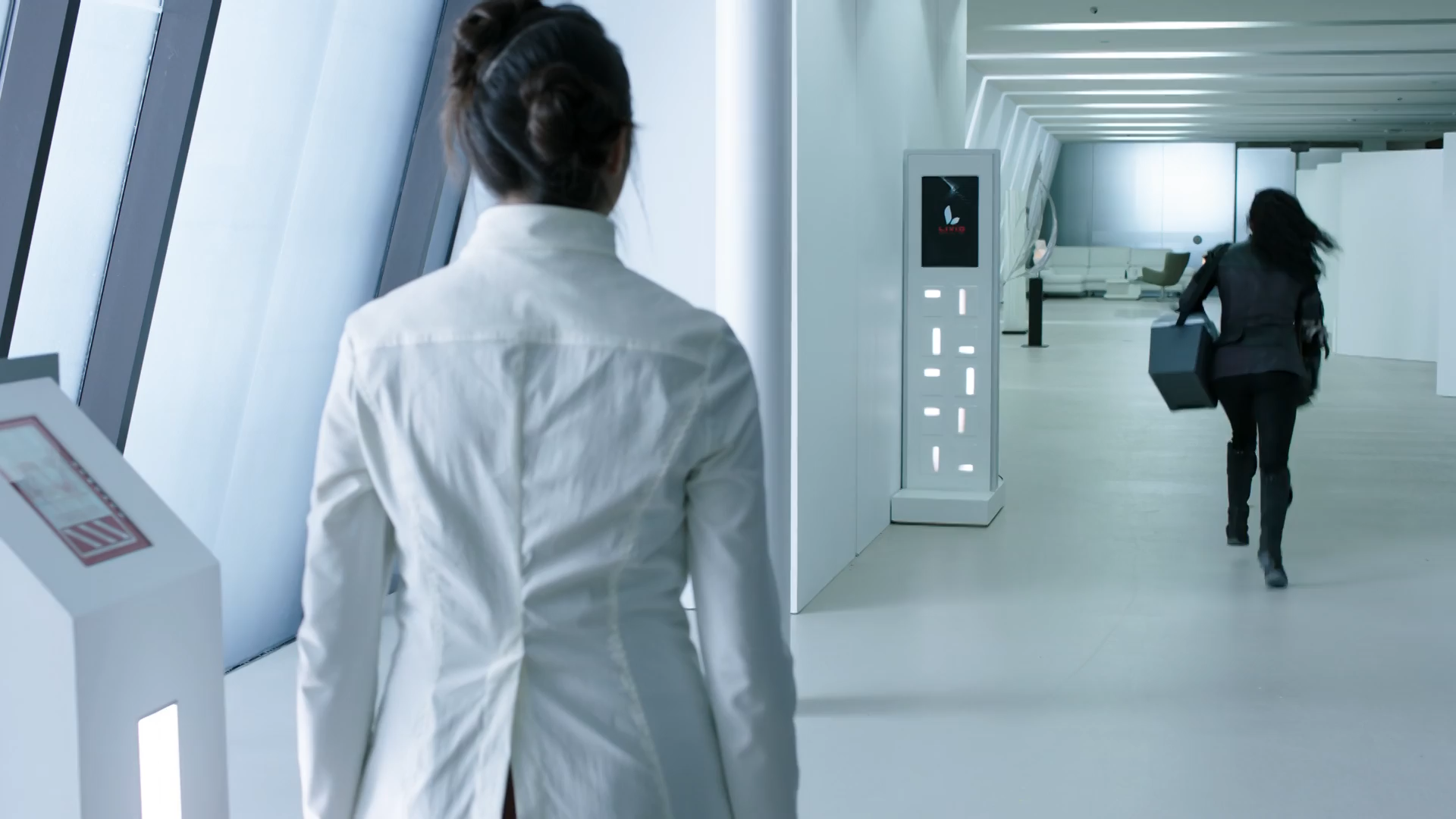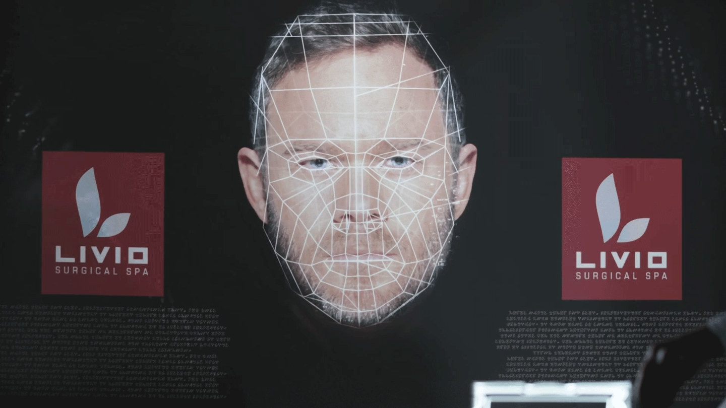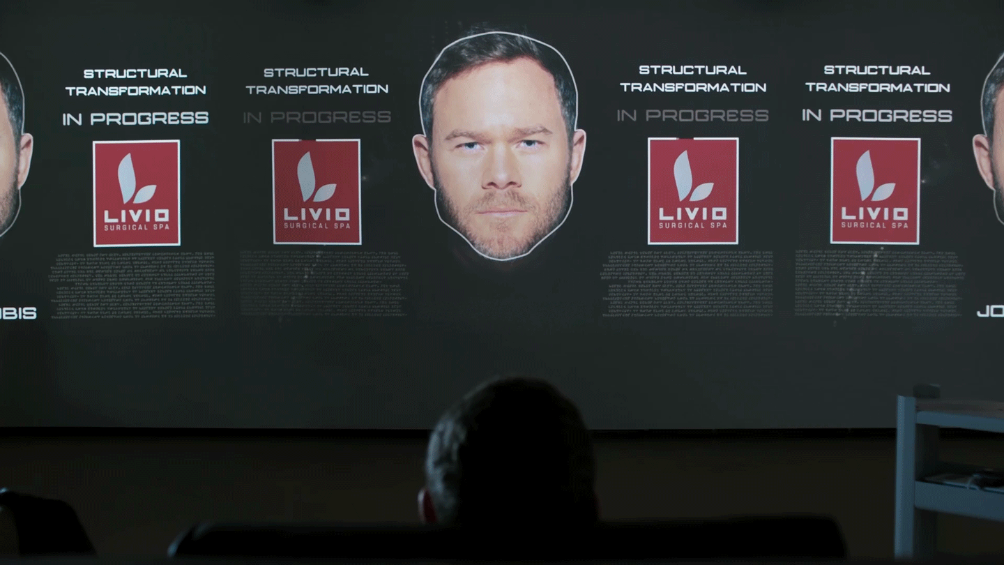 Johnny makes himself comfortable as he gets his face scanned to see what cosmetic upgrades Livio could provide, which involved live projection of the "possible outcome" on set. The spa also contained an assortment of hand-scanning tablets and minimal screen graphics in the set design.