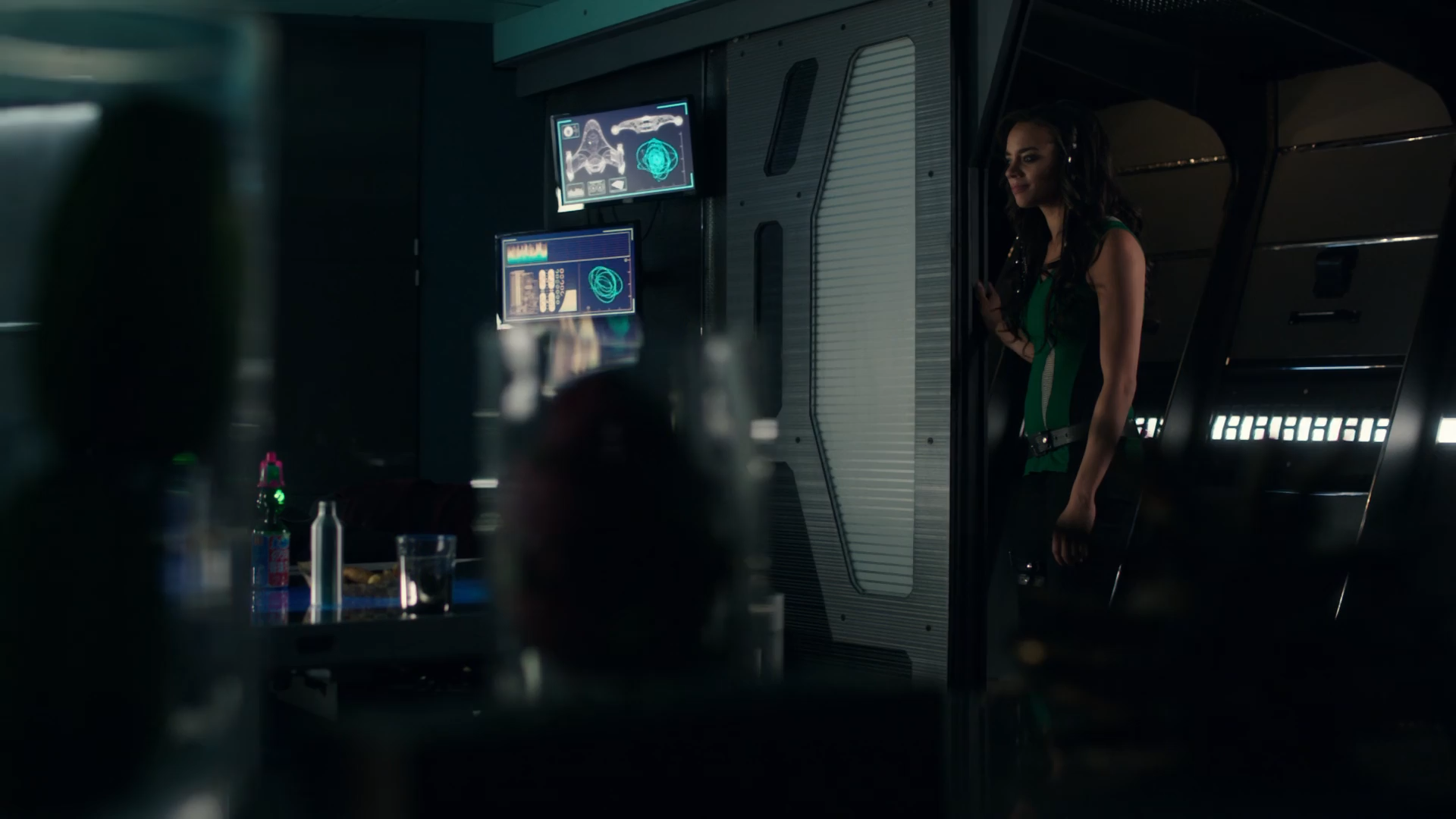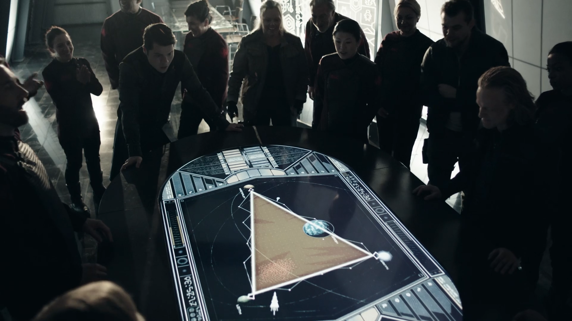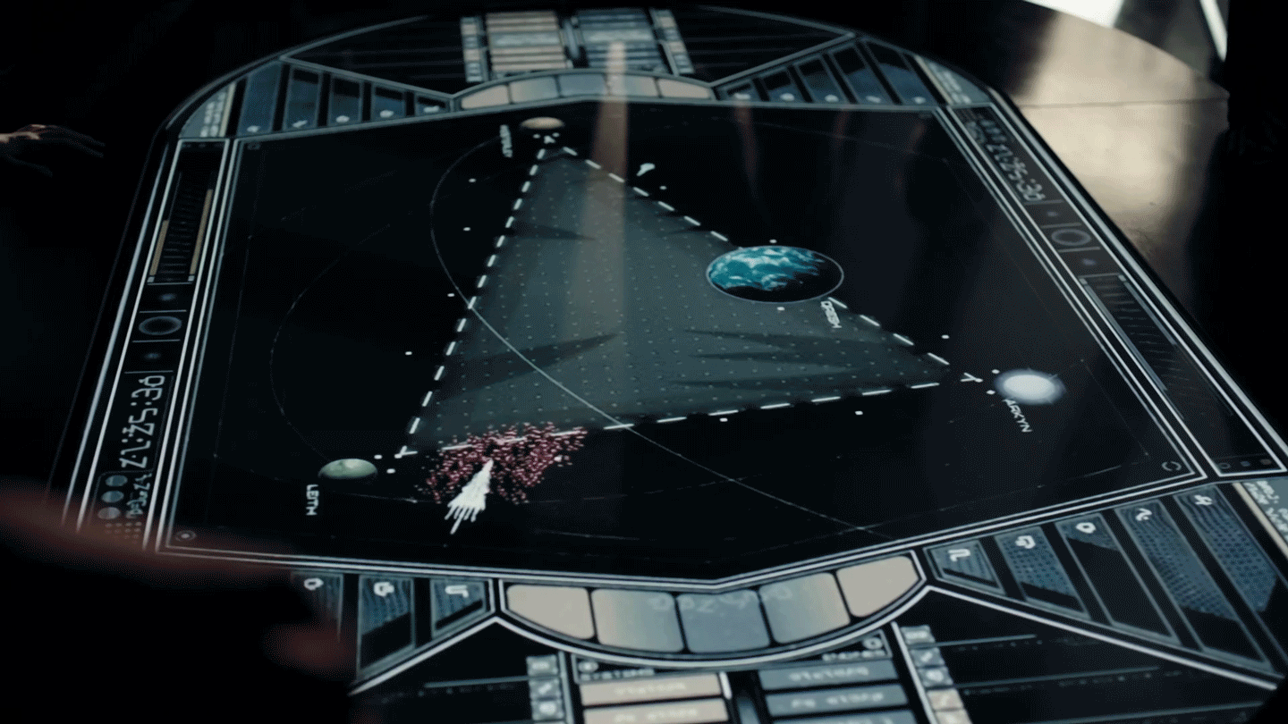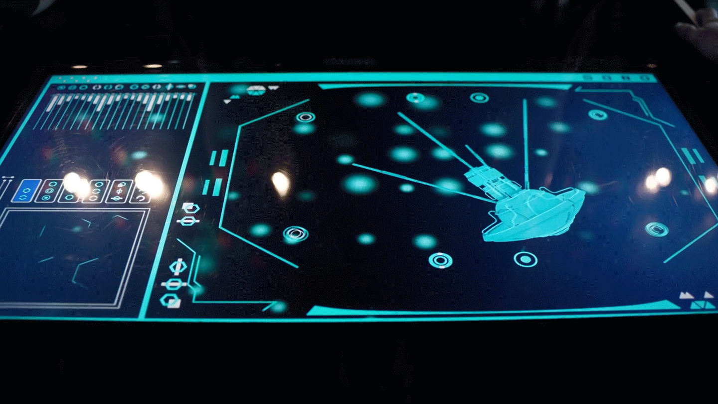 The interior screens stood out in the sparse and brightly lit ships and were meant to provide visual interest as well as help later on in the season to show narrative driven sequences on the main table console.