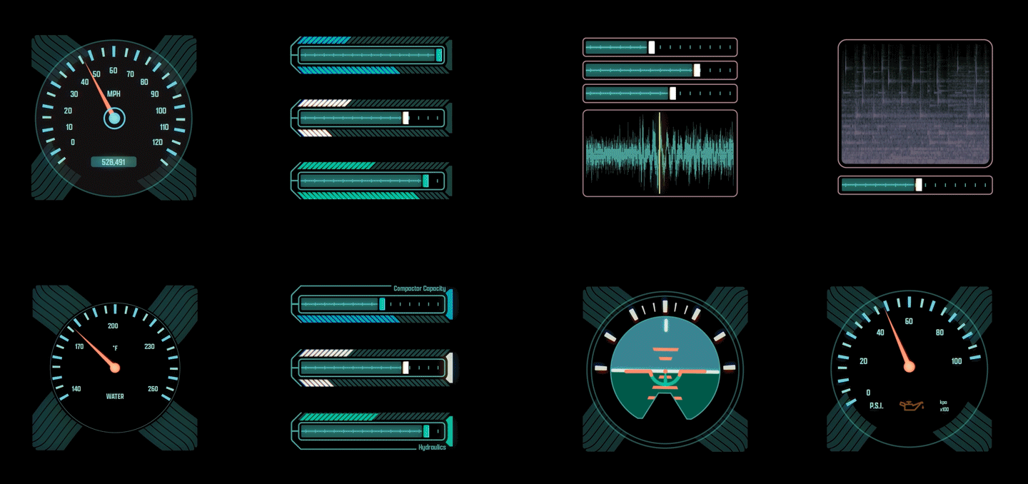 Within the cabin of the truck, there was an array of small screens on the dashboard and ceiling. I created an assortment of dial gauges and dashboard readings to add visual interest to the control clusters.